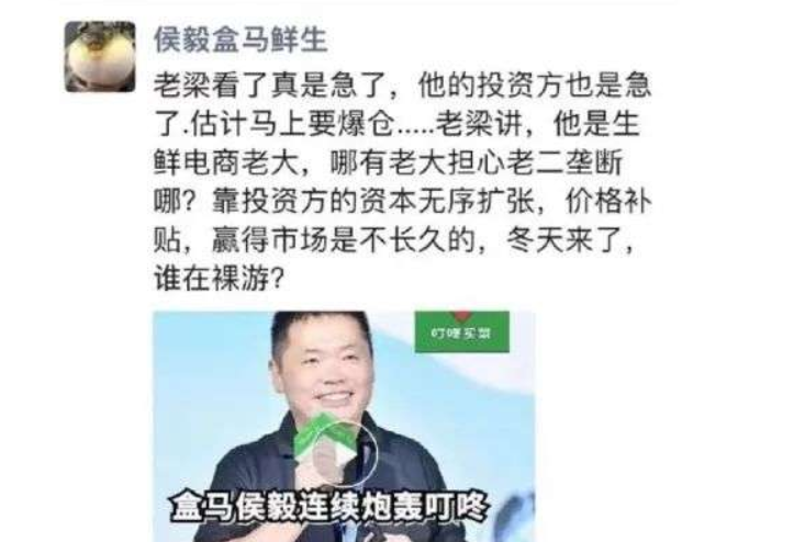 “老梁看了真是急了,他的投资方也是急了,估计马上要爆仓……老梁讲,他是生鲜电商老大,哪有老大担心老二垄断”。日前有消息显示,盒马鲜生CEO侯毅近日在社交媒体中,发布了这样一条“炮轰”叮咚买菜CEO梁昌霖的内容。