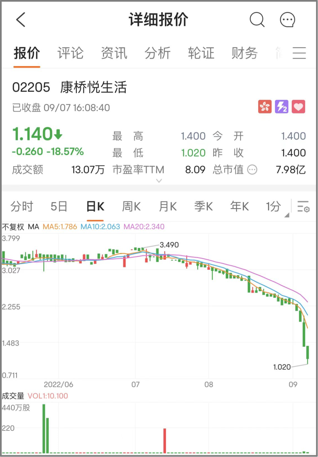 今天分析的主角叫康桥悦生活(02205.hk),其引起物股通关注是因为股价在2个月时间内持续阴跌,截至9月7日,区间跌幅已达67.24%,且近几日有加速下跌的趋势。