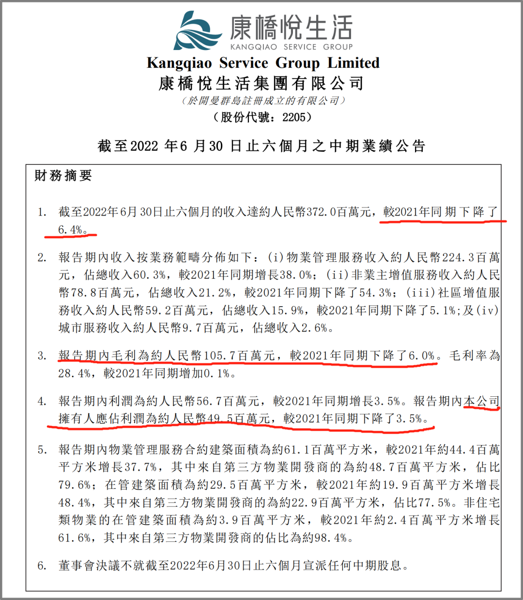 8月25日,康桥悦生活发布了2022年中期业绩报告,2022H1公司实现: