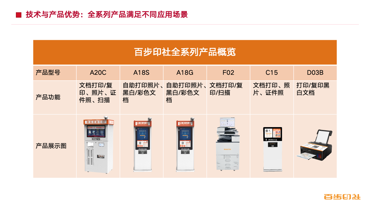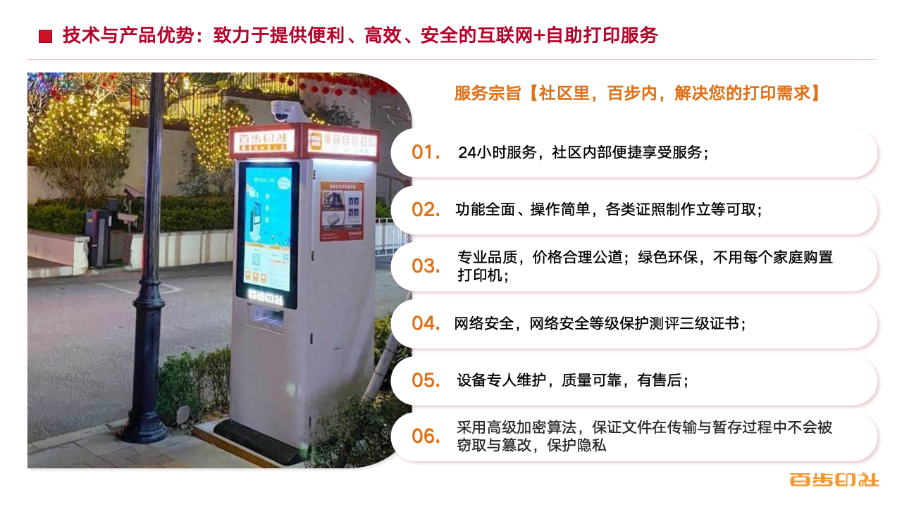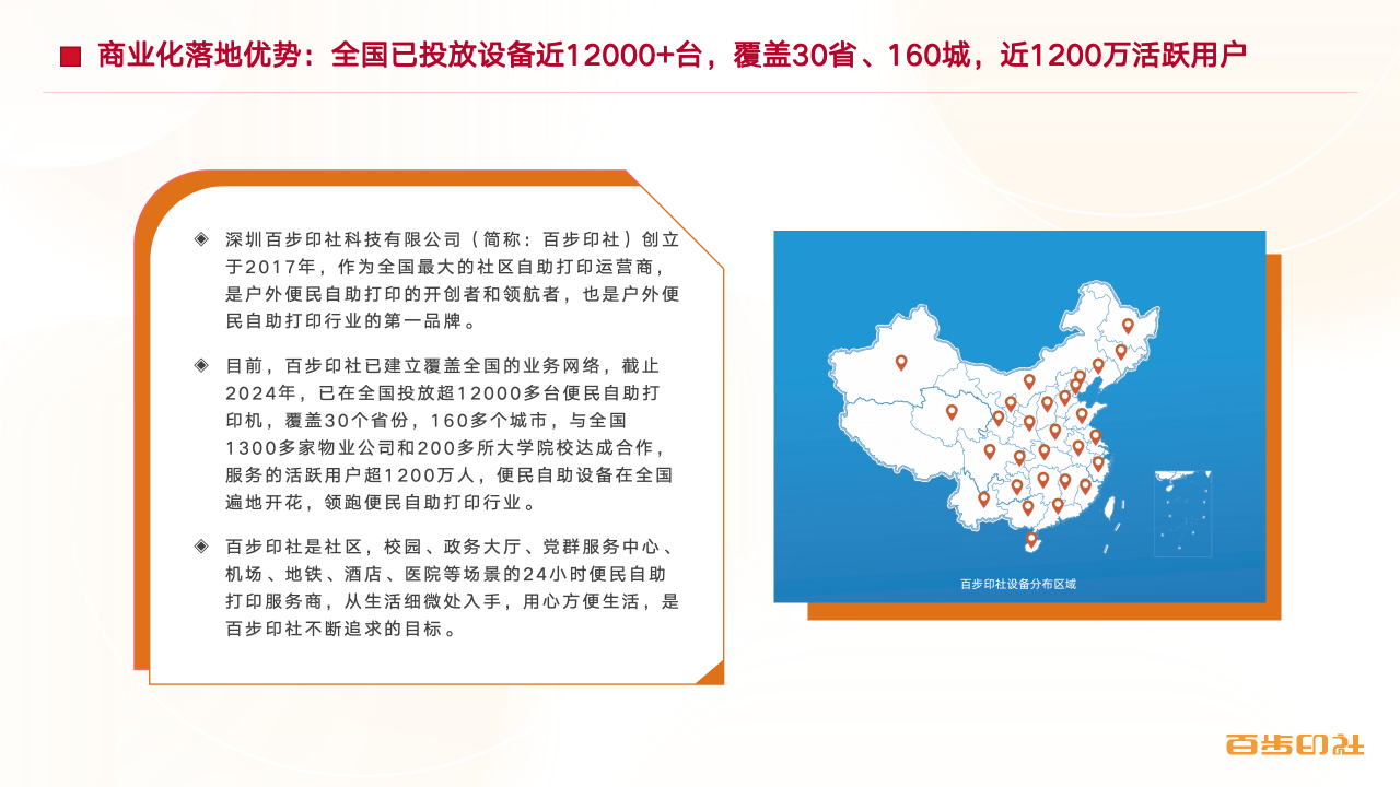 百步印社是户外便民自助打印的开创者与领航者。截至2024年,公司已在全国30个省份、160多座城市,投放了超过12,000台自助打印设备,与1,300多家物业公司及200多所高校建立了合作关系,累计服务超过1,200万活跃付费用户。这一规模让我们在社区自助打印领域稳居行业第一,并获得了“国家高新技术企业”“专精特新”企业等权威认定。