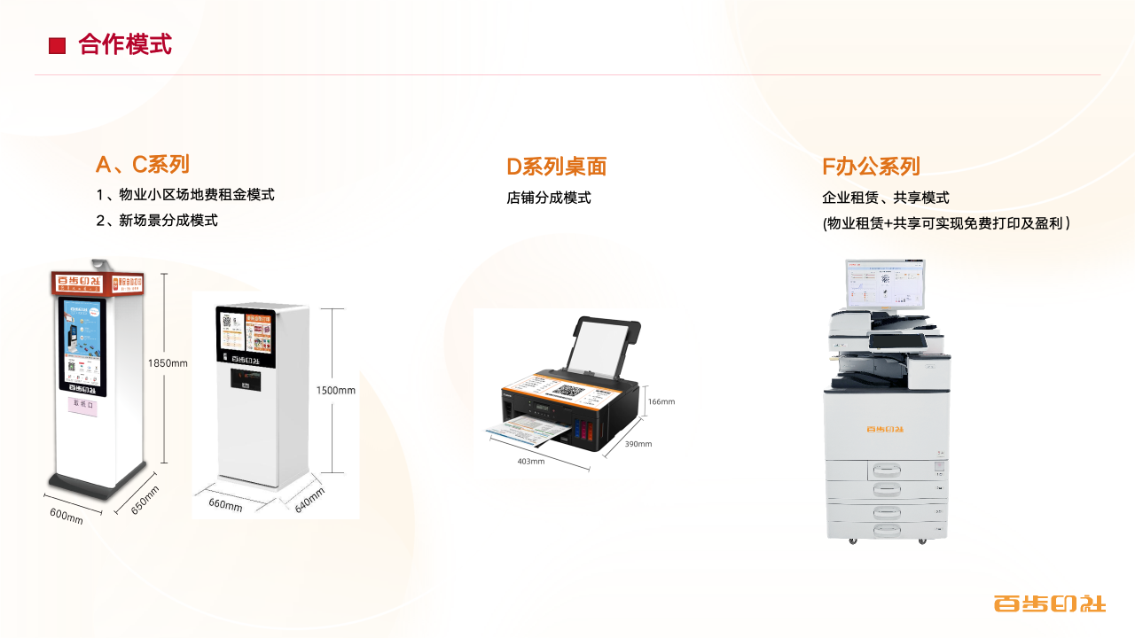 在合作模式上,我们有以下几种方案:对于社区公共区域,主要采用支付场地租金或营业流水比例分成的方式。对于物业服务中心自身的办公打印需求,则提供设备租赁与全包服务,免除物业在设备采购、维护、耗材上的所有后顾之忧。这种“共享+租赁”的组合模式,使物业在无需任何前期投入的情况下,既能提升对业主的服务品质,又能优化自身运营成本,并开辟新的增收渠道。