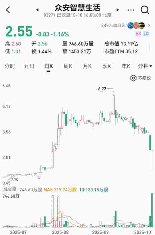 10月10日,迷你型上市物企众安智慧生活股价盘中上演“垂直坠落”。