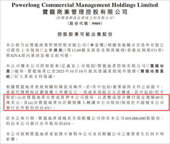 公告显示,其控股股东宝龙地产已于10月10日就境外债务重组订立支持协议,其中明确提出可通过出售、质押宝龙商业股份筹集4000万美元现金,或直接转让不超过32.4%的股份作为重组代价。