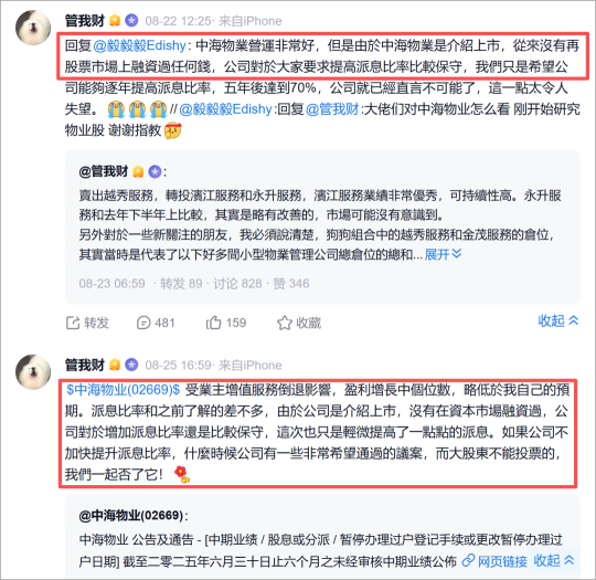 以2025年中期业绩为例,尽管公司强调“派息比率和之前了解的差不多”,但“轻微提高一点点”的表述,仍引发知名投资者“管我财”的公开不满:“如果公司不加快提升派息比率,什么时候有非常希望通过的议案,而大股东不能投票的,我们一起否了它!”