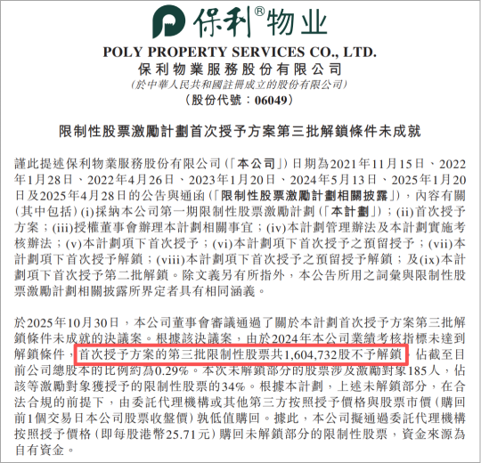 10月30日,保利物业发布公告称,公司限制性股票激励计划首次授予方案第三批解锁条件未成就,160.47万股限制性股票不予解锁。