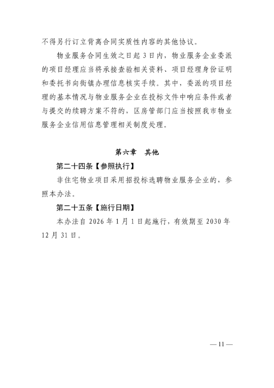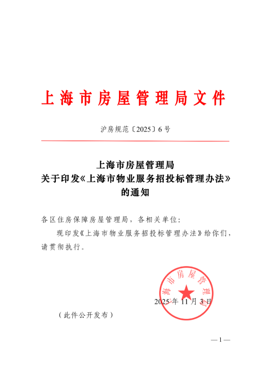 11月3日,上海市房屋管理局印发《上海市物业服务招投标管理办法》,自2026年1月1日起施行至2030年12月31日,聚焦住宅物业管理区域物业服务招投标全流程规范,推行全过程电子化操作,非住宅物业招投标参照执行。