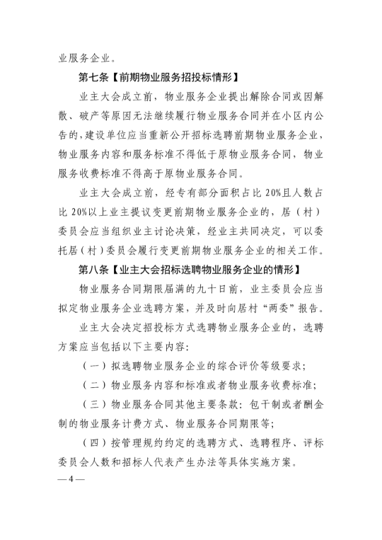 20%及以上业主提议变更前期物业的,经业主共同决定可委托居(村)委员会办理相关事宜。业主大会需在物业服务合同到期90日前拟定选聘方案,明确物业企业综合评价等级、服务内容与标准、收费方式、合同期限等核心内容,原物业企业符合条件可参与投标,同时明确六种不得续聘情形,包括列入严重违法失信名单、合同期内受行政处罚、综合评价最低等级、业主满意率低于80%、失信记分满6分及合同约定情形。具体内容如下: