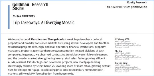 11月初,高盛走访了深圳和广州两座核心城市,通过考察多家开发商、一线住宅项目、高端商场运营商、金融机构、物业管理公司、房地产中介以及科技企业房地产/消费相关部门,对当地房地产市场及整体消费市场进行脉搏式调研。