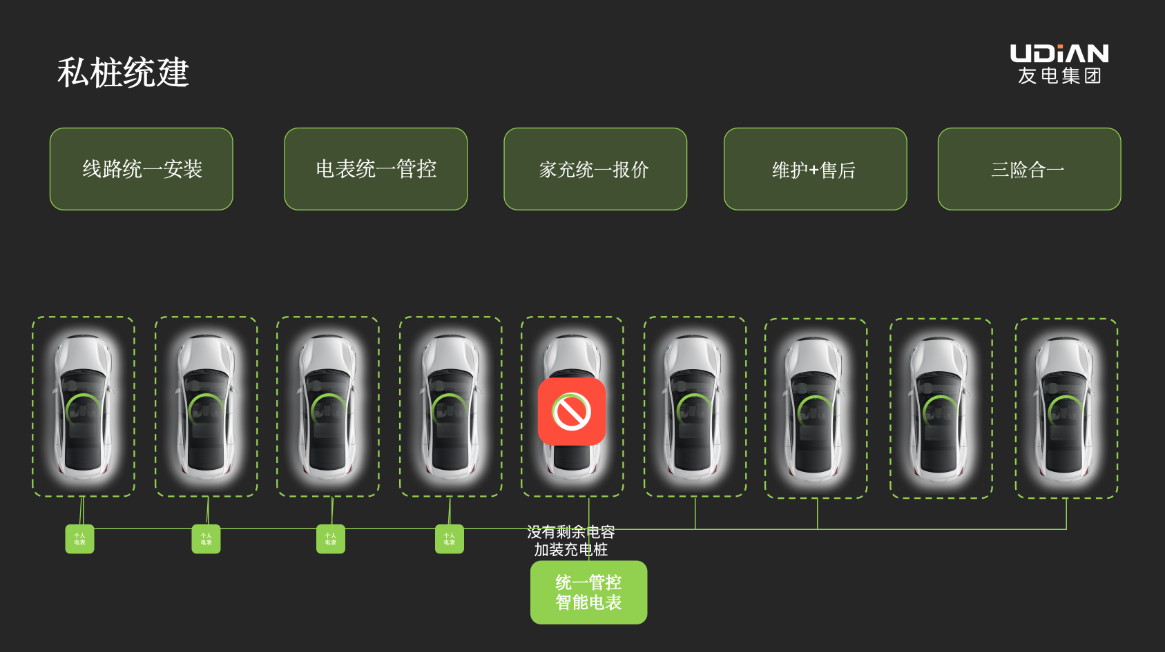 针对这些痛点,我们提出了一系列综合解决方案。在安全层面,公司推出“单车安全充电+消防”一体化方案,通过智能空开、声光报警、温度感应、火焰识别、自动喷淋及灭火球等设备联动,构建从预警到处置的全流程防护体系。针对四轮汽车,推出“目的地充电”模式,支持谷时充电、支付宝碰一碰秒充等功能,提升用户体验并缓解电容压力。此外,友电还创新推出“私桩统建”模式,通过智能配电柜统一管控电容量,在不增容的前提下提升装桩数量,实现公桩与私桩的统一管理与安全标准化。