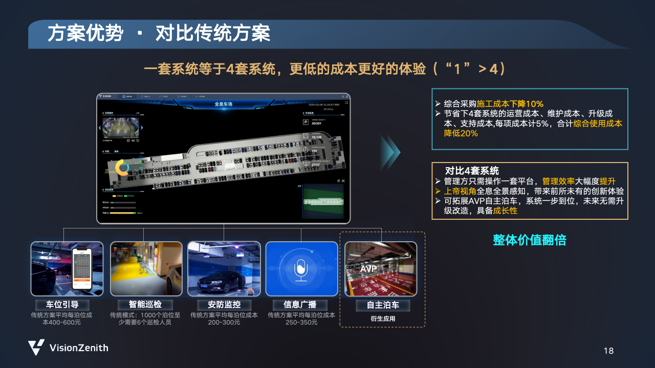 在成本与效率层面,“全息车场”以“一套系统替代多套系统”,综合采购与施工成本下降10%,使用成本降低20%,并具备面向AVP自主泊车的扩展能力,避免未来重复投入。目前,该系统已在深圳机场P2停车场等项目落地,通过21台全息感知相机覆盖140余个车位,实现了数字孪生管理、异常事件预警与自主泊车协同,成为智慧停车领域的标杆案例。
