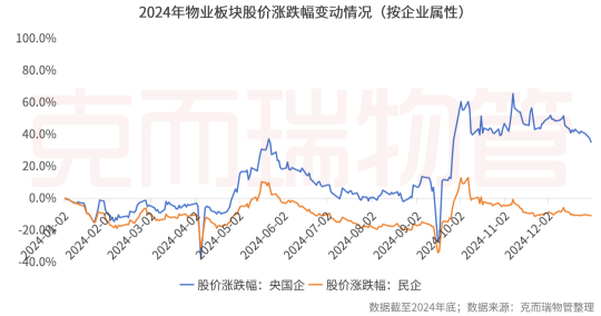 与康桥悦生活的民企身份形成对比的是,央国企背景物企在市场抗风险能力方面表现显著优于民营物企。报告显示,2024年央国企背景物企平均股价涨跌幅为35.1%,而民营物企则为-10.7%。