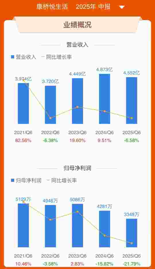 康桥悦生活此次全球化尝试背后,是难以忽视的经营压力。2025年上半年,公司收入约4.552亿元,同比下降6.58%;归母净利润约3348万元,同比下降21.79%。