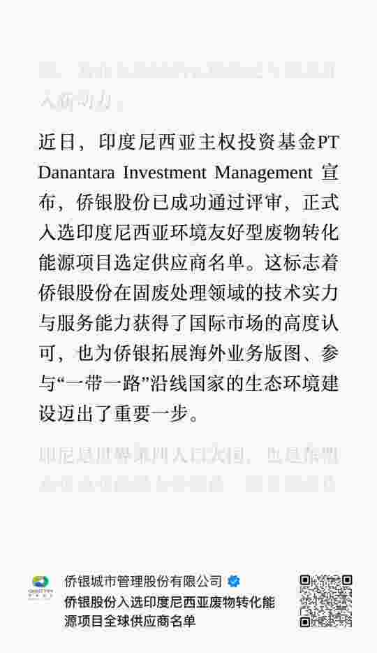 与中海物业不同,侨银股份在东南亚的环境服务拓展则展示了另一种路径。公司近日入选印度尼西亚环境友好型废物转化能源项目选定供应商名单。