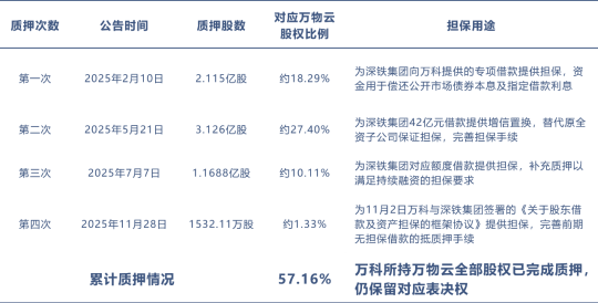 作为大股东的万科,已累计四次将所持万物云57.16%的全部股权质押给深铁集团,为合计超300亿元的借款提供担保,最新一笔质押更是为220亿元的整体融资框架筑牢增信屏障。