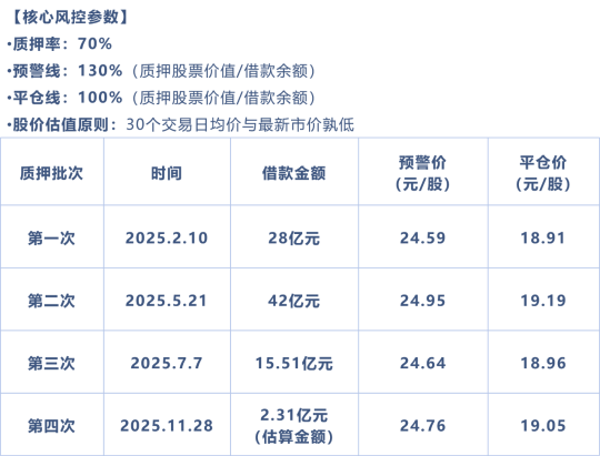 结合质押条款的约定测算,四次质押的预警价集中在24.59-24.95港元/股区间,平仓价则在18.91-19.19港元/股范围内,整体综合预警价为24.81港元/股、综合平仓价为19.08港元/股。