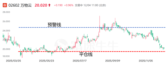 而万物云12月3日的收盘价已跌至19.83港元,不仅较49.35港元的发行价缩水超60%,更已跌破综合预警价,距19.08港元的平仓线仅一步之遥,距17.189港元的52周低点也仅差1.64港元。