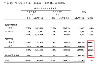 而收入结构中,三大板块除了物业管理服务收入保持正增长外,增值服务(业主增值服务和非业主增值服务双双下滑)和停车位卖卖业务同比分别下降8.3%、62.9%。