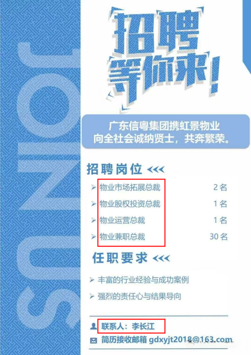 不过从一张招聘海报透露出来的信息推测,李长江拥有极高的决策权,招聘的岗位均是总裁级,而且物业兼职总裁需求量达到了30名。
