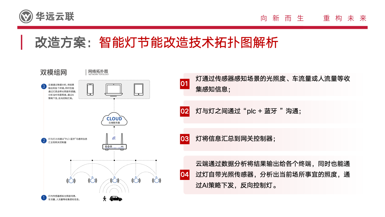 华远云联的智能节能灯系统由高光效LED灯管、多种传感器、物联网网关及云管理平台构成。通过无线Mesh组网技术,灯具之间可实现数据互通,并将信息汇总至云端进行分析处理。系统能够根据人流量、车流量、自然光照等条件自动调节亮度或开关,实现分区化、场景化的精细控制。