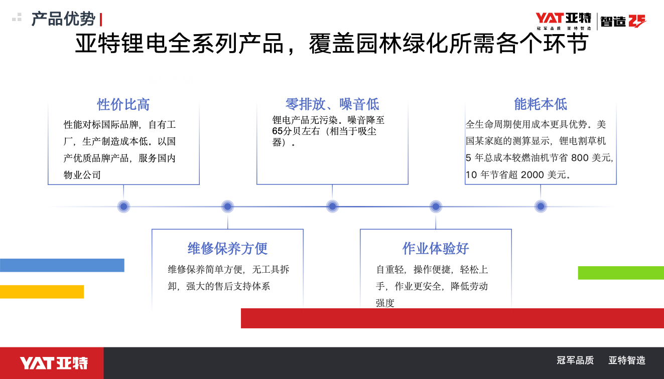 针对上述痛点,亚特电器基于多年深耕锂电技术的经验,提出了全面的锂电化产品解决方案。产品矩阵覆盖了园林绿化全流程所需,包括无刷自走式/手推式割草机、绿篱机、高枝锯、打草机、吹叶机、电链锯等。这些产品均采用高性能锂电平台,核心优势显著。首先,在性能上对标国际一线品牌,同时依托自有工厂与规模化生产,具备更优的性价比。其次,实现了零尾气排放,并将工作噪音大幅降低至约65分贝,显著改善作业环境。其三,从全生命周期成本考量,电力消耗相较于燃油费用更具经济性。其四,产品设计注重人性化,普遍具有重量轻、振动小、操作简便的特点,部分产品支持无工具拆卸,大大降低了使用门槛与劳动强度,同时配备了完善的售后服务体系。