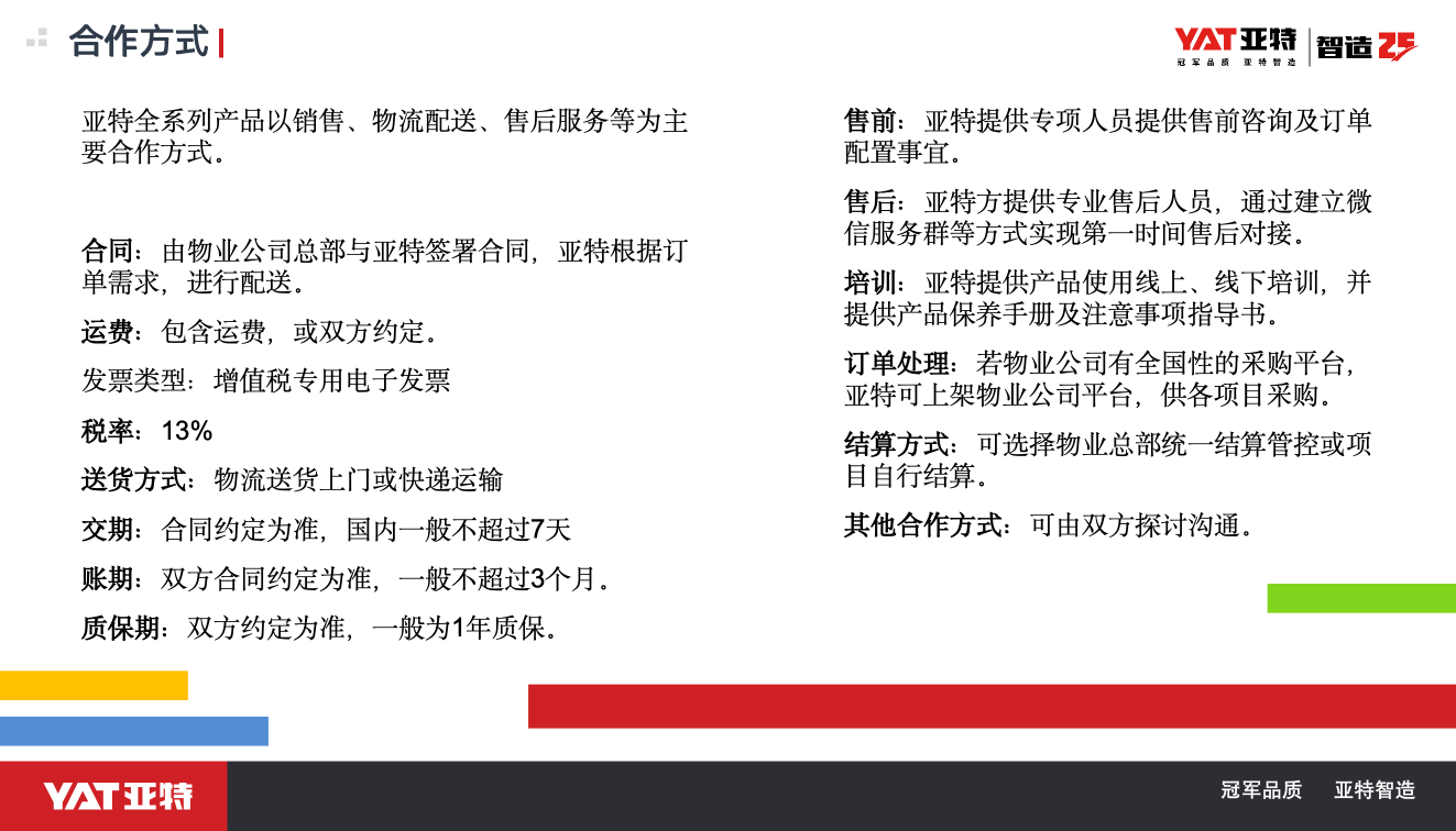 在合作模式上,亚特主要采取直接销售与服务支持相结合的方式。可与物业公司总部签订合同,提供从产品配置、物流配送到售后维保的全流程服务,并可根据客户需求安排产品使用培训。结算与配送方式灵活,支持总部统管或项目分结。近期,公司已成功进入国内头部物业市场,锂电园林系列产品于2025年7月中标万科物业集采项目,成为其合格供应商,这标志着亚特以高性价比的国产优质品牌产品服务国内物业市场的战略取得了实质性进展。