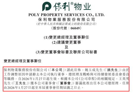 1月27日,保利物业公告: 总经理姚玉成、董秘尹超离任,接任者分别是王英男、刘龙。