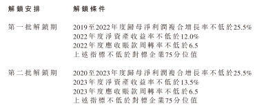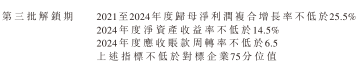 如第一批解锁期就要求2019至20222年归母净利润复合增长率不低于25.5%、2022年净资产收益率不低于12%应收账款周转率不低于6.5%,如上三个指标还要不低于对标企业的75%。
