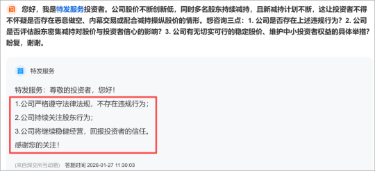 物股通注意到,1月27日特发服务在深交所互动易集中回应了投资者的密集质询,从公开的内容看,核心矛盾直指公司股东频繁减持、股价持续创新低引发的系列信任危机。