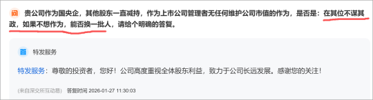 针对市值管理不作为的质疑,公司仅以“高度重视全体股东利益,致力于公司长远发展”回应,未结合国企身份提出任何市值维护的实际方案,如股份回购、高管增持、现金分红、业绩说明会等,回应流于形式。