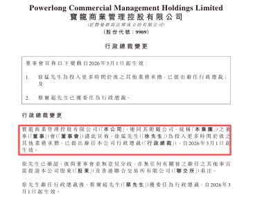 3月1日,宝龙商业公告,行政总裁徐猛辞任。