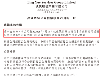 领悦服务将于2026年4月13日对该地块提交标书。此次公开招标起拍价为人民币1.43亿元,不包括税项。